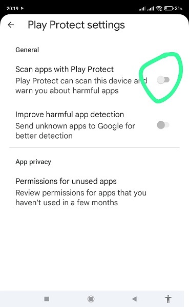 1. Perhatikan pada halaman Play Protect Setting ada 2 (dua) pilihan On/Off, silahkan geser ke mode ON untuk pilihan bagian atas ( lihat lingkaran hijau pada gambar diatas).